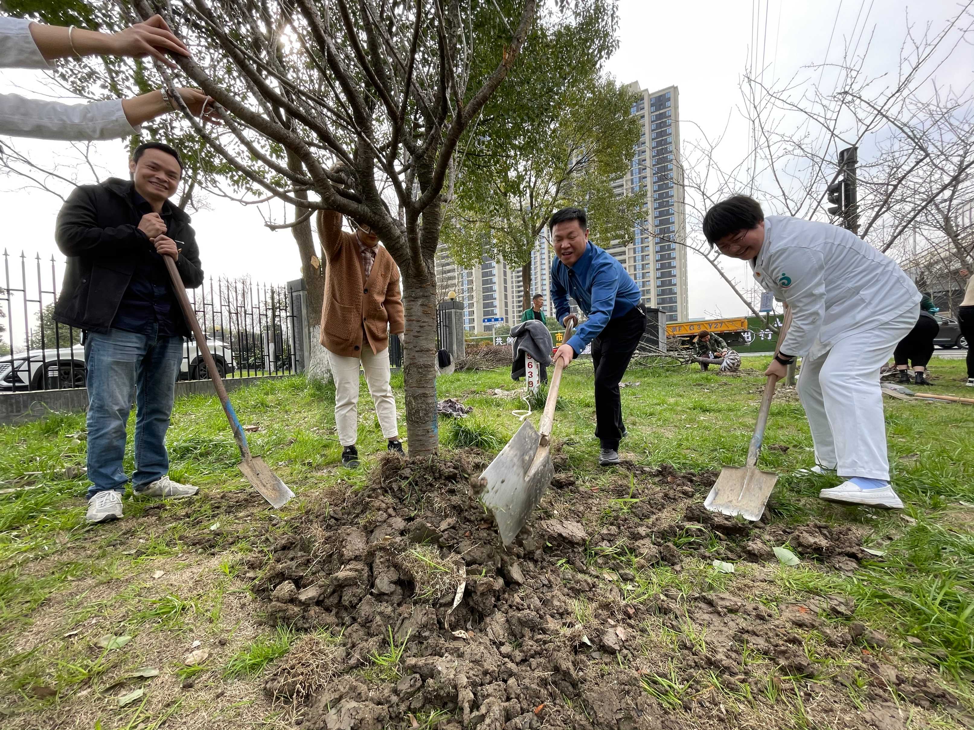 鏟土刨坑、扶樹培土、填坑踩土,大家齊心協力、扎扎實實完成每一道工序,經過近一個小時的辛勤努力,8棵櫻花樹、8棵海棠樹就此安下“新家”,在初春的微風里昂揚挺立,展現出勃勃生機。