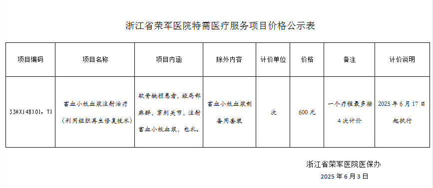 浙江省榮軍醫院特需醫療服務項目價格公示