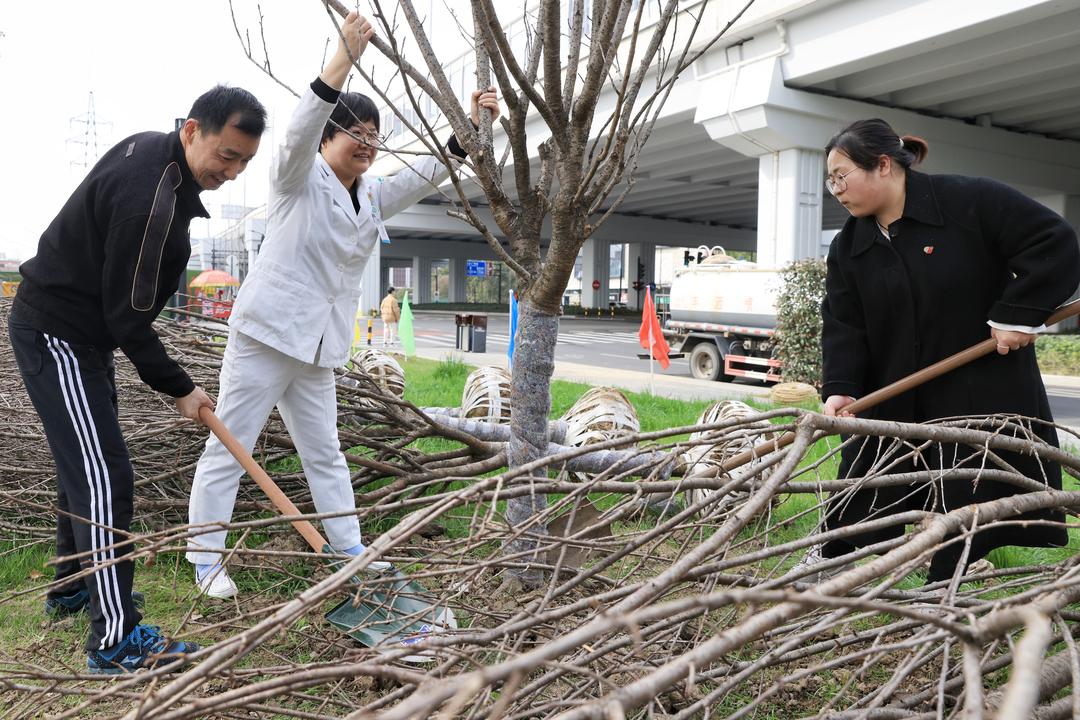 鏟土刨坑、扶樹培土、填坑踩土,大家齊心協力、扎扎實實完成每一道工序,經過近一個小時的辛勤努力,8棵櫻花樹、8棵海棠樹就此安下“新家”,在初春的微風里昂揚挺立,展現出勃勃生機。