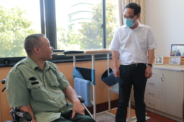 在榮軍病區(qū),林云舉親切看望慰問在院休養(yǎng)榮軍代表徐國(guó)平、胡映芳,與榮軍面對(duì)面交談,當(dāng)看到他們個(gè)個(gè)神采奕奕的時(shí)候,林云舉十分高興,囑咐他們要保重身體,安心休養(yǎng),并提前致以“八·一”節(jié)日祝福和慰問。